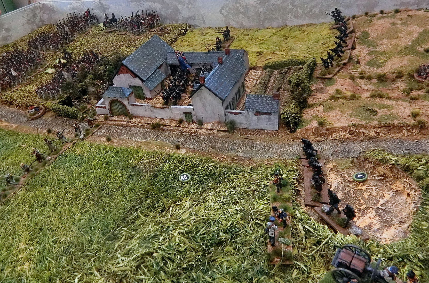 | ...but on the other flank the French have once again been repulsed from an attack on LHS. However 2LB KGL (the skirmishers outside the LHS stable block) have suffered badly over the nearly two hours of fighting |