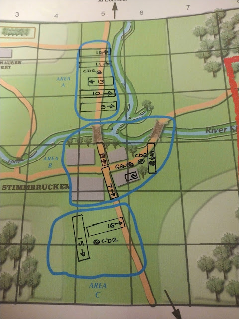 | Centre column spans the River Stimm, and in the foreground are the troops of both sides not yet available or visible |