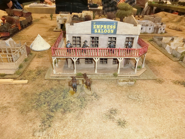 I moved round to chat to Ian Bailey, and Paul of Empress Miniatures, as they'd entertained me hugely at this event last year with an Indian Mutiny game. It emerged that Ian's intended game was not ready and so Paul had ridden to the rescue like John Wayne with a Western game. Forgive the little film star joke but Paul explained that the figures (approx 32mm) and game concept were more like a Hollywood western than history. They were using "Dead Man's Hand" rules.